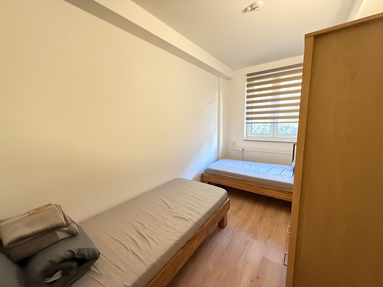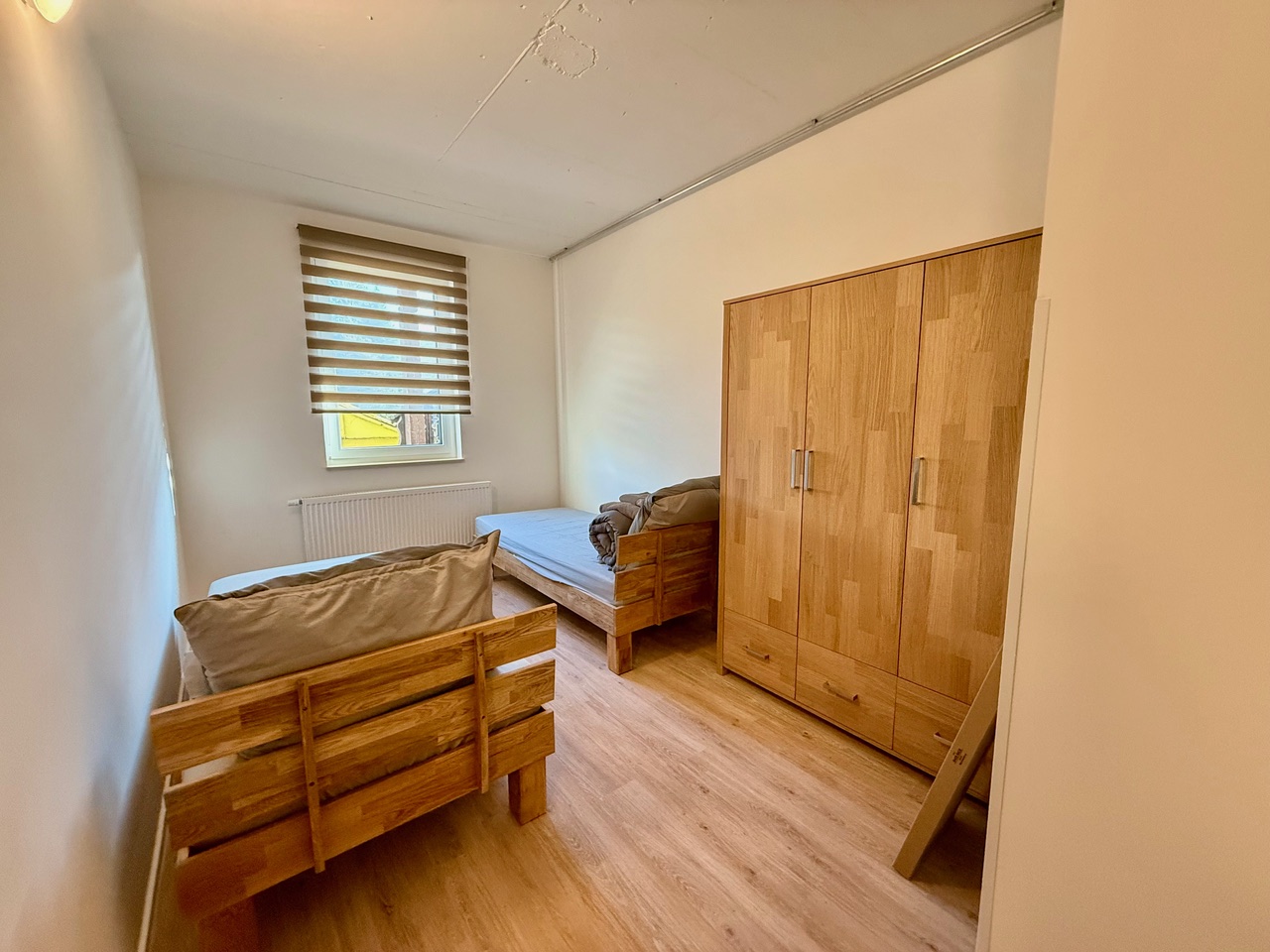 Die Zimmer sind hell und funktional eingerichtet, mit Nachttisch, Schuhregal und Garderobe.